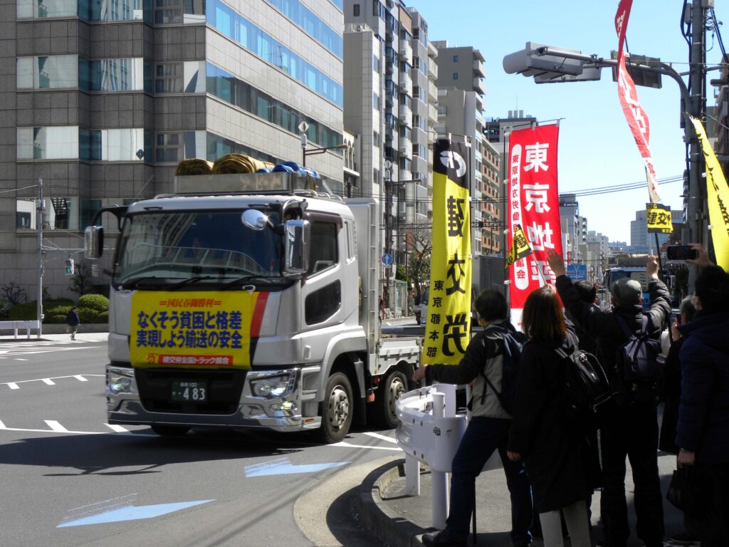 パレードは4梯団に分かれ、浜離宮庭園まで約2時間かけスタートしました。途中、門前仲町の建交労東京都本部前には、組合員や東京地評の仲間も駆けつけ、車列を激励しました。イラン情勢を受け運